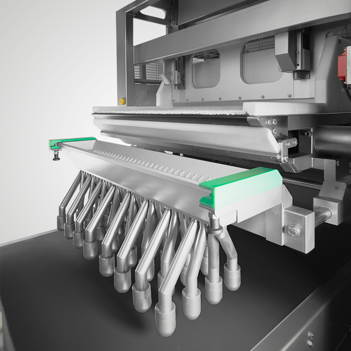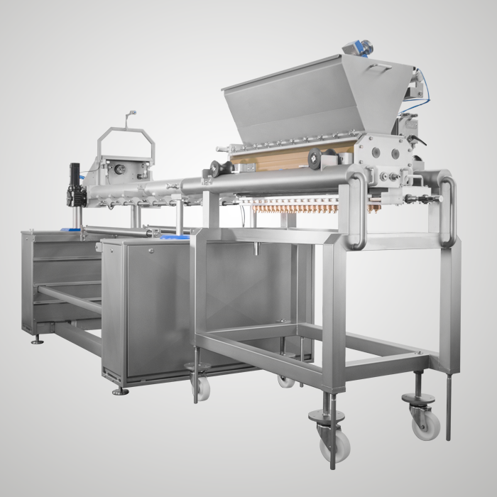 Dosificadora de rodets amb bombes de dosificació independents per a la producció de galetes dosificades, de tall de filferro, éclairs, bunyols i profiteroles. Accionada per motors sense escombretes i PLC per obtenir una àmplia gamma de regulacions, elevada precisió de funcionament i memorització automàtica de dades i receptes. La dosificadora es pot construir segons les necessitats del client i pot comptar amb les següents característiques: