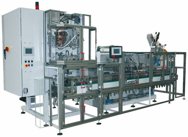 Double-bottomed package forming machine, with modular structure and independent stations, suitable for receiving square packages, formed and filled by a vertical packaging placed above. The stations are driven by "brushless" motors.